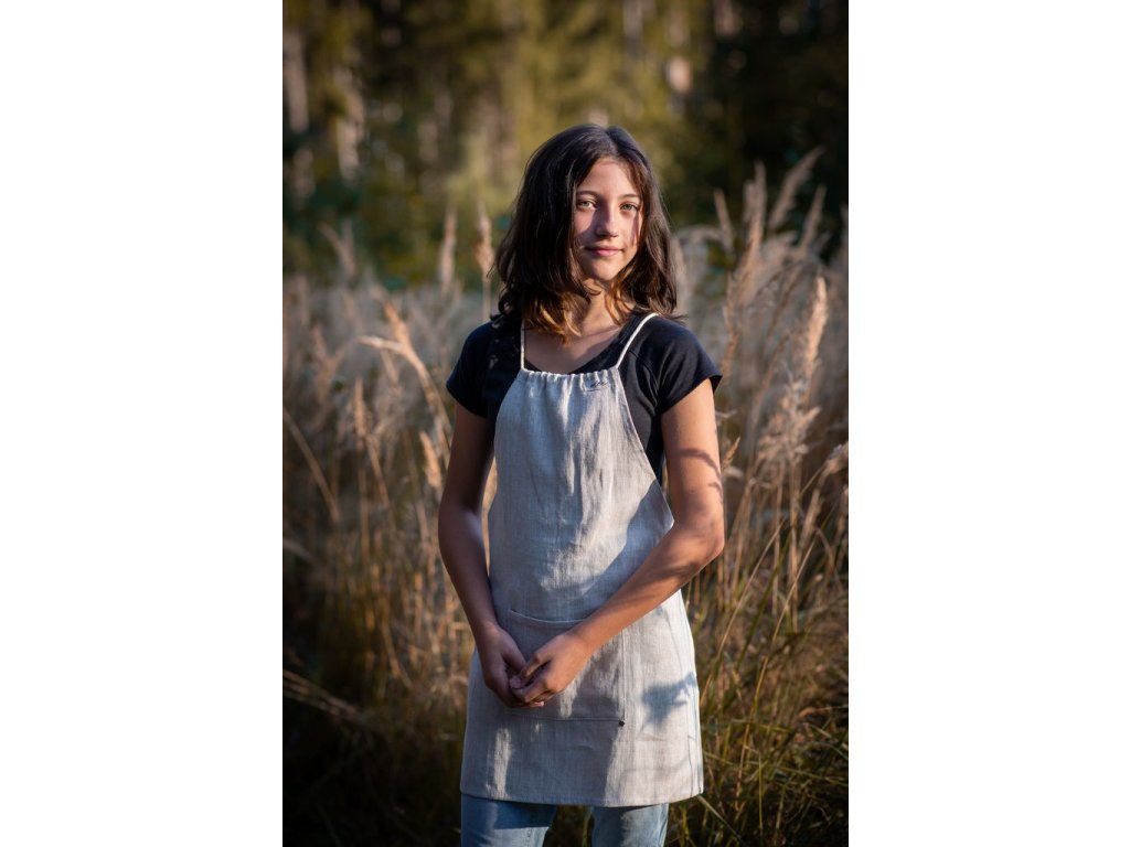 Je ušitá tak, aby byla co nejvíce variabilní různým postavám a hlavně pohodlná. Tato zástěra má oproti klasickým zástěrám překřížení ze 100% bio bavlněné šnůry pro snadné oblékání a také proto, aby vás netahala kolem krku. Zástěra je vyrobená z měkoučké látky – 100% lnu vysoké gramáže(245g/m2). Záměrně jsme vybrali tento materiál pro jeho dlouhou životnost a pro příjemný pocit při nošení. Můžete je i v ní poslat na kroužky, do školky, do školy, na různá tvoření při výtvarce nebo je nechat jen tak pobíhat po zahradě.